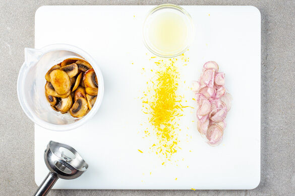 Die Schalotte schälen, halbieren und in feine Streifen schneiden. Die Zitronenschale abreiben, dann die Zitrone halbieren und auspressen. Die 1/2 der gebratenen Pilze samt Butter in ein hohes Gefäß geben und abgedeckt beiseitestellen.