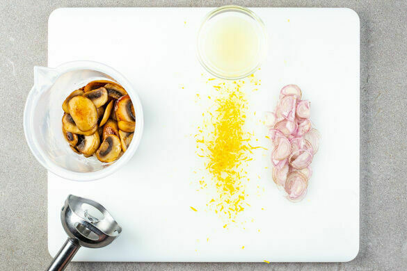 Die Schalotten schälen, halbieren und in feine Streifen schneiden. Die Zitronenschale abreiben, dann die Zitrone halbieren und auspressen. Die 1/2 der gebratenen Pilze samt Butter in ein hohes Gefäß geben und abgedeckt beiseitestellen.