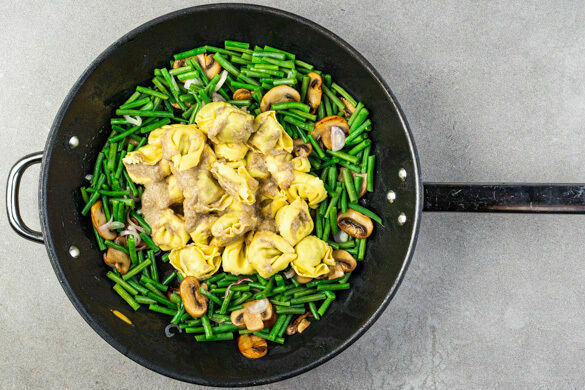 Allein beim Anblick dieser Delikatesse läuft einem schon das Wasser im Munde zusammen – wie soll das erst werden, wenn man den ersten Bissen auf die Gabel nimmt, die Augen schließt ... und ... Ach, aber zuerst muss der wohlverdiente Gaumenschmaus ja zubereitet werden! Die mit Pesto gefüllten Tortelloni sind mit der herrlich trüffeligen Pilzsauce und den zitronigen grünen Bohnen in ihrem Element. Immer eine Traumreise wert!