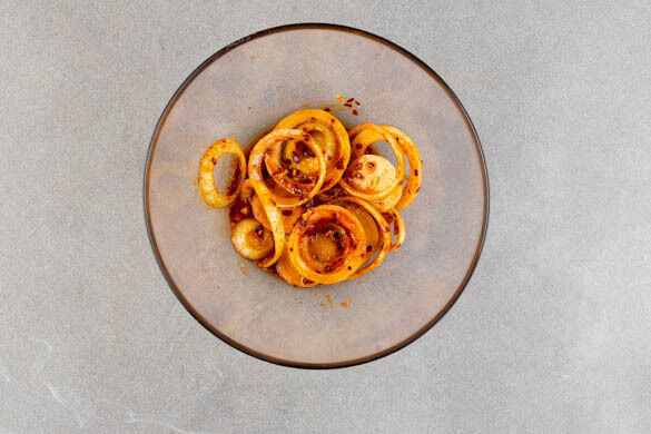 Den Ofen auf 200°C (180°C Umluft) vorheizen. Die Zitrone halbieren und auspressen. Den Knoblauch schälen und grob würfeln. Die Zwiebeln schälen und in 1cm breite Ringe schneiden. Den Knoblauch, das Paprikapulver, die 1/2 der Chiliflocken, 2EL Olivenöl, 1EL Zitronensaft, 1EL Senf, 1EL Honig und 1/2TL Salz in einer großen Schüssel verrühren, die Zwiebeln untermengen.