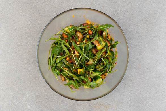 Die Gurke längs vierteln und in 1–2cm große Stücke schneiden. Die Rauchmandeln grob hacken, dann mit den Gurken und dem Rucola vermengen.