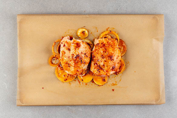 Das Fleisch trocken tupfen, zu den Zwiebeln in die Schüssel geben und gut mit den Zwiebeln und dem Würzöl vermengen. Die Zwiebeln auf einem mit Backpapier ausgelegten Backblech mittig anordnen, dann das Fleisch mit der Hautseite nach oben darauflegen und im Ofen ca. 20Min. backen. Die Schüssel mit dem restlichen Würzöl aufbewahren.