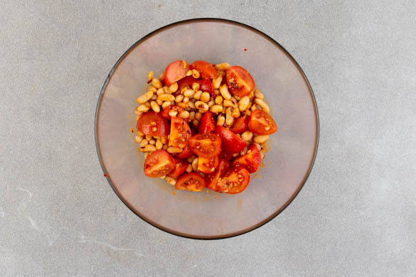 Die Bohnen in einem Sieb mit kaltem Wasser abspülen und abtropfen lassen. Die Tomaten vierteln. Die Bohnen und die Tomaten in die Schüssel geben und ebenfalls mit dem Würzöl vermengen.