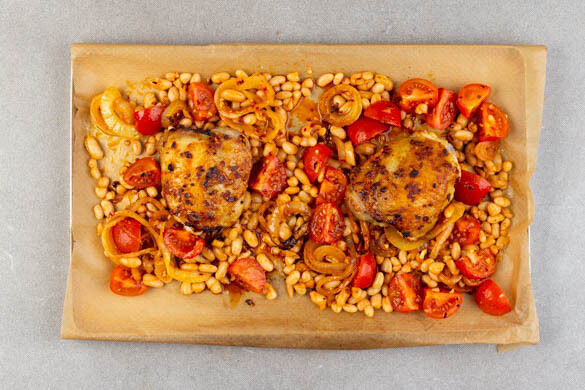 Wäre Bequemlichkeit eine Untugend, müssten wir beim Kochen heute so richtig Gewissensbisse bekommen. Ohne viele Handgriffe finden sich saftige Hähnchenoberkeulen im pikanten Paprika- und Chilimantel im Ofen wieder. Die warmen Salatzutaten, namentlich Cannellinibohnen, Tomaten und Zwiebeln, schlüpfen mit aufs Backblech und werden danach nur noch mit Rucola, Rauchmandeln und frischen Gurken vermengt. Et voilà: Es ist serviert!