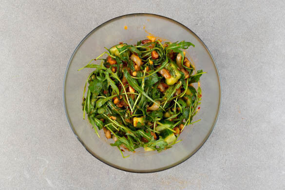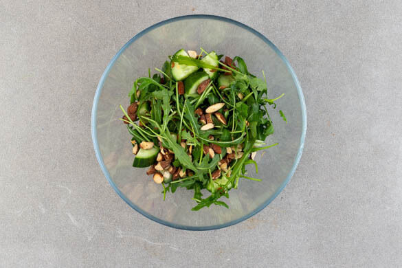 Die Gurken längs vierteln und in 1–2cm große Stücke schneiden. Die Rauchmandeln grob hacken, dann mit den Gurken und dem Rucola vermengen.