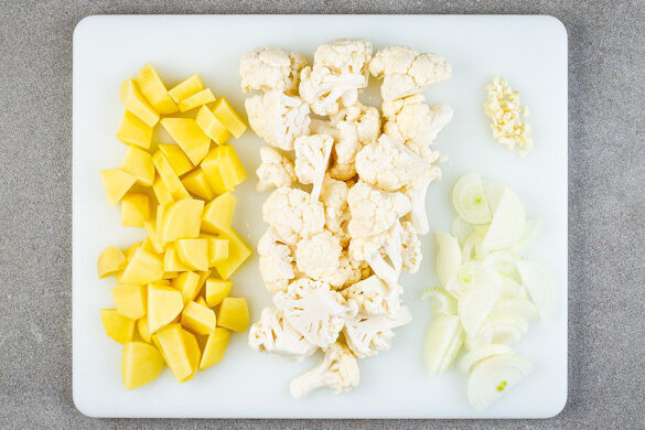 Den Backofen auf 220°C (200°C Umluft) vorheizen. Die Kartoffeln schälen und in ca. 2cm große Stücke schneiden. Den Blumenkohl ebenfalls in 2–3cm große Stücke schneiden. Die Zwiebeln schälen, halbieren und in feine Streifen schneiden. Den Knoblauch schälen und grob würfeln.