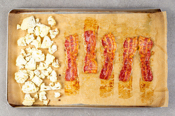 Die Baconscheiben auf eine Seite eines mit Backpapier ausgelegten Backblechs legen. Den restlichen Blumenkohl in ca. 1cm große Röschen schneiden und auf der anderen Seite des Blechs mit 1EL Pflanzenöl und 1 Prise Salz vermengen. Im Ofen 11–13Min. backen, bis der Bacon knusprig und der Blumenkohl appetitlich gebräunt ist.