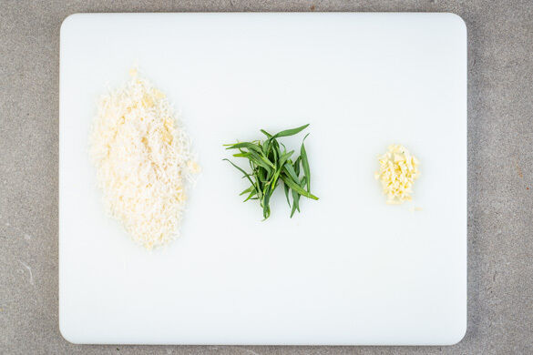 Den Käse fein reiben. Den Knoblauch schälen und grob würfeln. Die 1/2 der Estragonblätter von den Stängeln zupfen und beiseitelegen. Den Knoblauch in die Paprikapfanne geben und ca. 1Min. mitbraten.