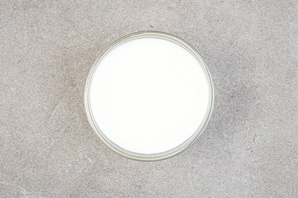 In einem kleinen Topf ausreichend Wasser für die Eier zum Kochen bringen. Die Zitronenschale fein abreiben, die Zitrone in Spalten schneiden. Den Knoblauch schälen und grob schneiden. Den Feta zerkleinern, in einem hohen Gefäß mit dem Knoblauch, 90ml Milch und 2TL hellem Essig cremig pürieren. Mit Salz und Pfeffer abschmecken.
