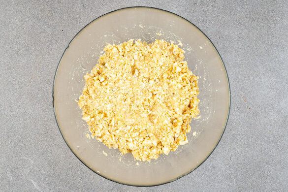 Den Backofen auf 240°C (220°C Umluft) vorheizen. 2 Eier in einer großen Schüssel schaumig aufschlagen. Die Zwiebeln schälen, grob raspeln und mit 200g Kichererbsenmehl, dem Blumenkohlreis, der Gewürzmischung, 4EL Olivenöl und je 1TL Salz und Pfeffer in die Schüssel geben. Alles zu einem trockenen Teig vermengen.