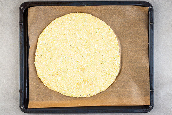 Den Teig auf zwei mit Backpapier ausgelegte Backbleche geben, jeweils zu einem Kreis mit einem Durchmesser von ca. 28cm und einer Dicke von ca. 0,75 cm ausrollen und gut zusammendrücken, damit er kompakt ist. Im Ofen in ca. 25Min. hellgold backen, dabei die Position der Bleche nach der Hälfte der Zeit tauschen.