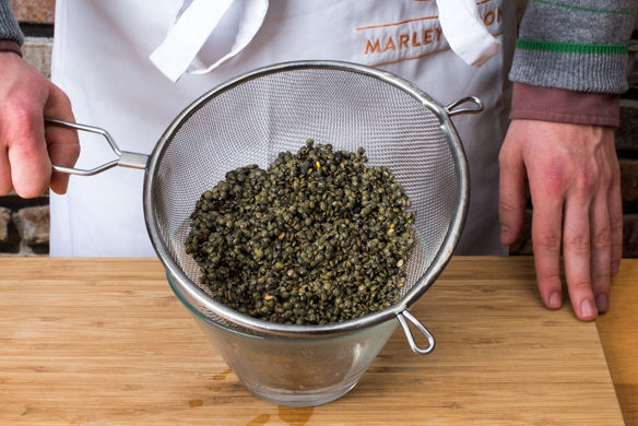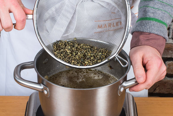 Die Grünen Linsen in einem Sieb mit lauwarmem Wasser abspülen, bis das Wasser klar ist.