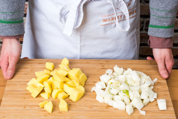 Den Fenchel halbieren und den Strunk herausschneiden, dann in ca. 1-2cm große Würfel schneiden. Falls Fenchelgrün vorhanden ist, für die Garnitur zur Seite legen. Die Kartoffeln schälen und ebenso in ca. 1-2cm große Stücke würfeln.