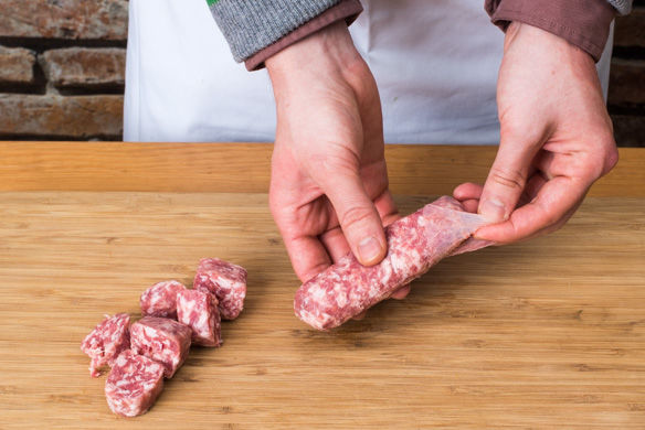 Die Salsiccia mit einem scharfen Messer von der Pelle befreien und in ca. 1-2cm große Stücke schneiden. Die Tomaten abtropfen lassen und grob hacken.