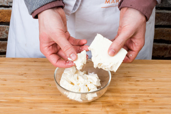 Den Käse in kleine Stücke brechen. Den Eintopf nochmals mit Salz und Pfeffer nachschmecken und mit Käse und den restlichen Tomaten garniert servieren.