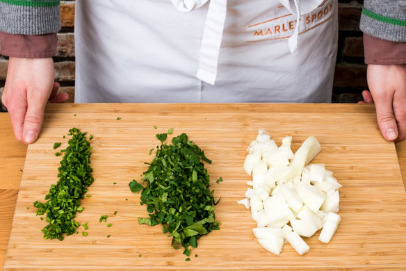 Währenddessen die Zwiebel schälen und grob hacken. Die Petersilie mit Stiel und den Schnittlauch klein hacken.