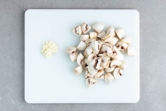 In einem großen Topf ausreichend gesalzenes Wasser für die Pasta zum kochen bringen. Die Pilze ggf. säubern und vierteln. Den Knoblauch schälen und in feine Scheibchen schneiden.