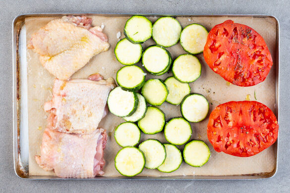 Die Zucchini mit 2TL Olivenöl und 1 kräftigen Prise Salz vermengen, gleichmäßig in der Mitte des Backblechs verteilen und den Knoblauch samt Schale zwischen das Gemüse legen. Das Fleisch ebenfalls auf das Backblech geben und alles 20–25Min. im Ofen backen, bis das Gemüse goldbraun und das Fleisch gar ist.