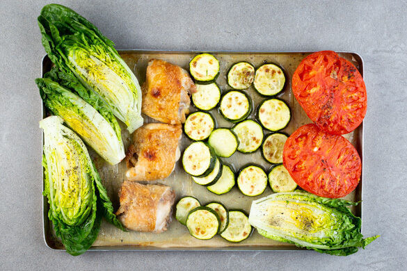 Hier liegt der Clou im Kleingedruckten: Im Ofen geschmurgeltes Hähnchen und Gemüse – namentlich Zucchini, Romanasalat und Fleischtomate – sind gut. Noch viel besser werden sie allerdings mit unseren kleinen Verfeinerungsideen: Da gibt es einerseits ein fein-zitroniges Schnittlauchdressing, andererseits eine raffinierte Vinaigrette mit geröstetem Knoblauch. Welche ist dein Favorit?