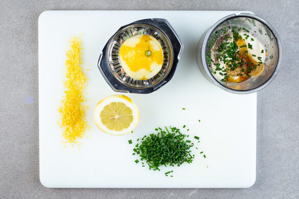 Die Zitronenschale abreiben, dann die Zitrone halbieren und auspressen. Den Schnittlauch fein schneiden. Die Crème fraîche, 1EL Zitronensaft, die 1/2 des Schnittlauchs, 2TL Senf, 1TL Honig, 2TL Wasser sowie 1 kräftige Prise Salz in einem hohen Gefäß mit einem Stabmixer zu einem cremigen Dressing pürieren und 1/2TL Zitronenschale unterrühren.