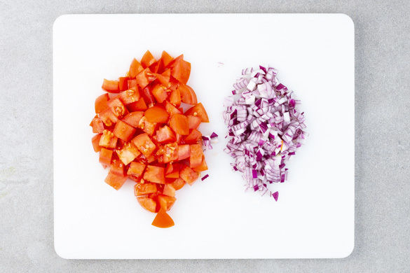 In einem großen Topf ausreichend gesalzenes Wasser für die Nudeln zum Kochen bringen. Die Tomaten halbieren und in kleine Würfel schneiden. Die Zwiebel schälen, halbieren und fein würfeln.