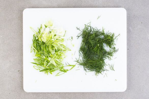 Die Lauchzwiebel schräg in sehr dünne Ringe schneiden. Die Dillspitzen von den Stängeln zupfen und grob schneiden.
