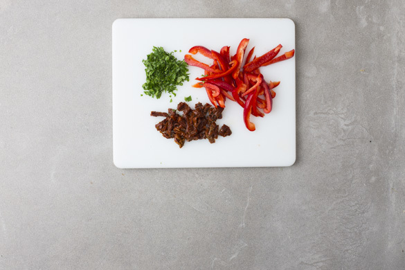 Die Paprika vierteln, entkernen und in feine Streifen schneiden. Die getrockneten Tomaten in feine Streifen schneiden. Die 1/2 der Petersilienblätter abzupfen und fein schneiden. Die restliche Petersilie samt Stängeln grob schneiden und in einem hohen Gefäß mit dem Basilikumöl, 1–2EL Olivenöl, 1–2EL Wasser sowie Salz und Pfeffer zu einem Pesto pürieren.