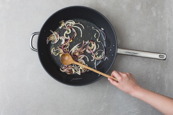 Die Zwiebeln und den Knoblauch mit 1EL Olivenöl und 1 Prise Salz in einer mittelgroßen Pfanne bei mittlerer Hitze 1–2Min. glasig anschwitzen, dann vom Herd nehmen.