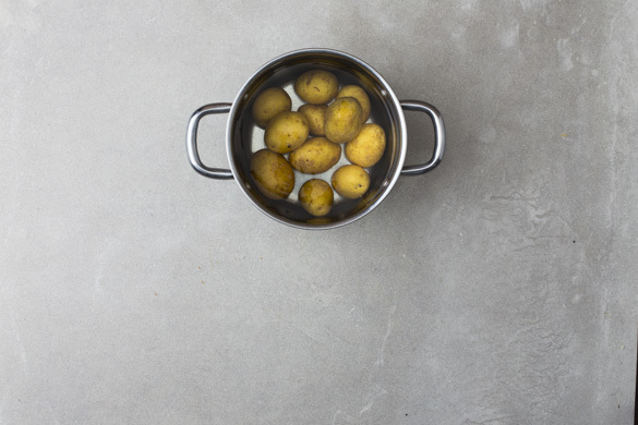 In einem mittelgroßen Topf ausreichend gesalzenes Wasser für die Kartoffeln aufsetzen. Tipp: Wer mag, kann die Kartoffeln schälen. Sobald das Wasser kocht, die Kartoffeln je nach Größe in 15–20Min. gar, aber nicht zu weich kochen. Durch ein Sieb abgießen und etwas auskühlen lassen.