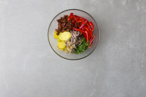 Die gekochten Kartoffeln in dünne Scheiben schneiden und mit der Paprika, den getrockneten Tomaten, der restlichen Petersilie und dem Pesto vermengen. Die Zwiebeln und den Knoblauch mit dem Öl aus der Pfanne dazugeben und untermischen. Mit 1–2EL Olivenöl, 2–3EL Essig sowie Salz und Pfeffer abschmecken.
