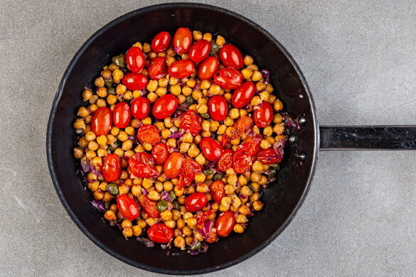 Die Kichererbsen in einem Sieb mit kaltem Wasser abspülen und abtropfen lassen. Die Kichererbsen, die Kirschtomaten und 1TL Zucker in die Pfanne geben und bei mittlerer bis starker Hitze 6–8Min. braten, bis die Tomaten aufplatzen und die Kichererbsen leicht gebräunt sind. Gelegentlich umrühren.