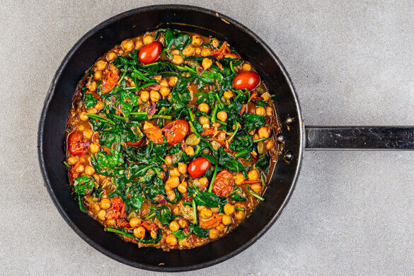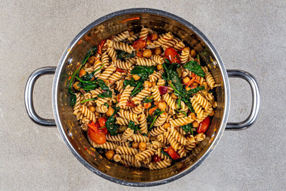 Was macht man, wenn man ganz viel Hunger und ganz wenig Zeit hat? Na klar, Nudeln! Vollkornpasta und Kichererbsen machen satt und halten lange vor, ohne zu beschweren. Dazu kommen noch süße Kirschtomaten, zarter Spinat und eine frische, zitronige Sauce mit Knoblauch und gebratenen Kapern – und schon ist der Hunger gebannt und du startest mit neuer Energie in den Rest des Tages!