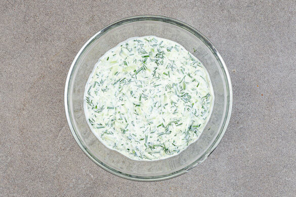 Die Gurke quer halbieren, eine Hälfte raspeln und in einem Sieb die Flüssigkeit auspressen. Den Knoblauch schälen und fein würfeln. Den Dill und den Schnittlauch fein schneiden. Die Gurkenraspel mit dem Knoblauch, den Kräutern, dem Joghurt, 3EL Mayonnaise und 1EL Essig verrühren. Das Dressing mit Salz und Pfeffer abschmecken.