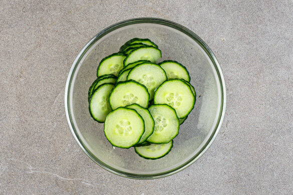 Die restliche Gurke in dünne Scheiben schneiden. 1EL Essig, 1EL Wasser, 1TL Zucker und 1/2TL Salz verrühren, bis sich Salz und Zucker aufgelöst haben. Die Gurkenscheiben in den Einlegesud legen, beiseitestellen und gelegentlich umrühren.