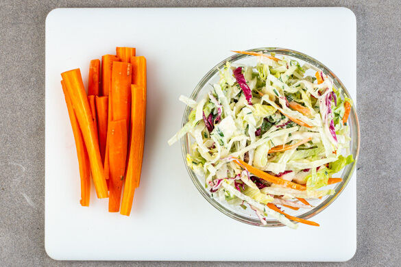 Die Karotte ggf. schälen, längs vierteln und quer halbieren. Die Salatmischung mit 3–4EL Dressing vermengen.