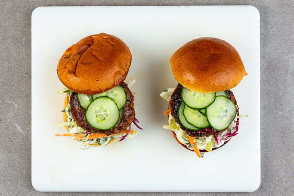 Die Brötchen aufschneiden und die Schnittflächen ca. 1Min. in der Pfanne mit ggf. restlicher Sauce anrösten. Mit 1–2EL Dressing bestreichen, dann mit etwas Salat, den Pattys und einigen Gurkenscheiben belegen. Die übrigen Gurken mit dem restlichen Salat vermengen und die Burger mit dem Salat, den Karotten und dem restlichen Dressing servieren.