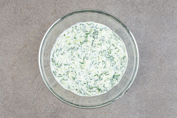 Die Gurke quer halbieren, eine Hälfte raspeln und in einem Sieb die Flüssigkeit auspressen. Den Knoblauch schälen und fein würfeln. Den Dill und den Schnittlauch fein schneiden. Die Gurkenraspel mit dem Knoblauch, den Kräutern, dem Joghurt, 5EL Mayonnaise und 2TL Essig verrühren. Das Dressing mit Salz und Pfeffer abschmecken.