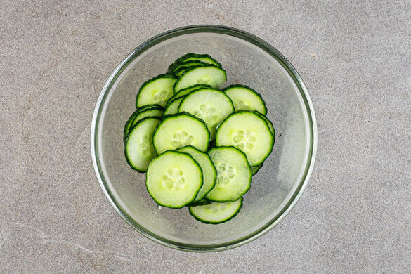 Die restliche Gurke in dünne Scheiben schneiden. 2EL Essig, 2EL Wasser, 2TL Zucker und 1TL Salz verrühren, bis sich Salz und Zucker aufgelöst haben. Die Gurkenscheiben in den Einlegesud legen, beiseitestellen und gelegentlich umrühren.