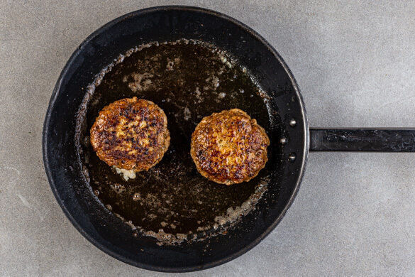 Das Hackfleisch mit der Gewürzmischung, 1TL Salz sowie 1 kräftigen Prise Pfeffer verkneten und zu vier gleich großen Kugeln formen. Die Hackbällchen leicht flach drücken und in einer großen Pfanne mit 2TL Olivenöl bei mittlerer bis starker Hitze auf jeder Seite 4–5Min. braten, bis die Pattys gar und appetitlich gebräunt sind.