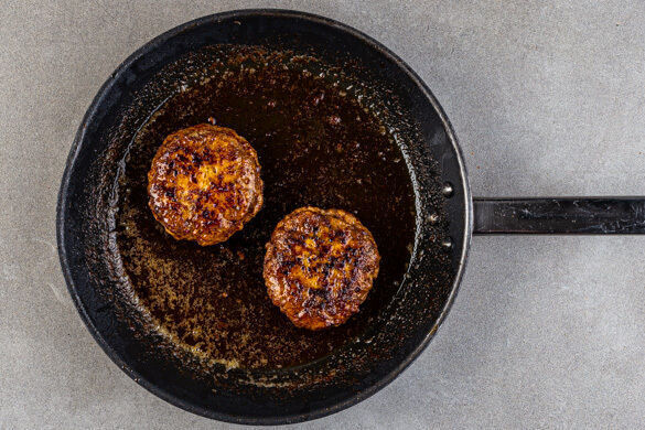 Die Pattys aus der Pfanne nehmen, dann die Sriracha-Sauce mit 2EL Butter in die Pfanne geben und bei mittlerer Hitze verrühren, bis die Butter geschmolzen ist. Die Pattys zurück in die Pfanne geben und rundum in der Sauce wenden, bis sie vollkommen bedeckt sind. Die Pattys aus der Pfanne nehmen und beiseitestellen.