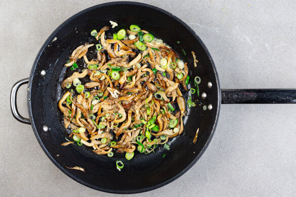 Die Pilze in einer großen Pfanne mit 1EL Olivenöl bei mittlerer bis starker Hitze 5–7Min. braten, dabei so wenig wie möglich umrühren, damit die Pilze etwas knusprig werden. Wenn die Flüssigkeit verdampft ist, den Knoblauch zugeben und ca. 1Min. mitbraten, dann die restlichen Lauchzwiebeln untermengen und mit Salz und Pfeffer würzen.