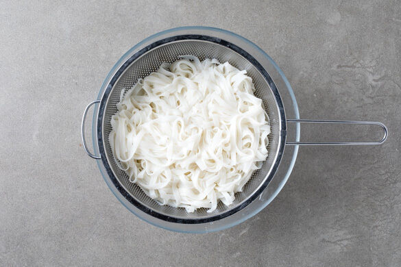Inzwischen die Nudeln in das kochende Wasser geben und gut umrühren. Den Topf vom Herd nehmen und die Nudeln ohne Hitzezufuhr ca. 8Min. ziehen lassen. In ein Sieb abgießen, zurück in den Topf geben und abgedeckt warm halten.