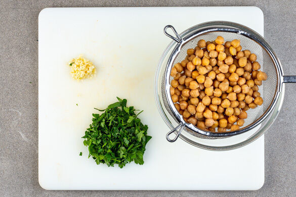 Die Kichererbsen in einem Sieb mit kaltem Wasser abspülen und abtropfen lassen. Die Petersilie samt Stängeln grob schneiden. Die übrige Knoblauchzehe schälen und fein würfeln. In einem mittelgroßen Topf 400ml Wasser zum Kochen bringen.
