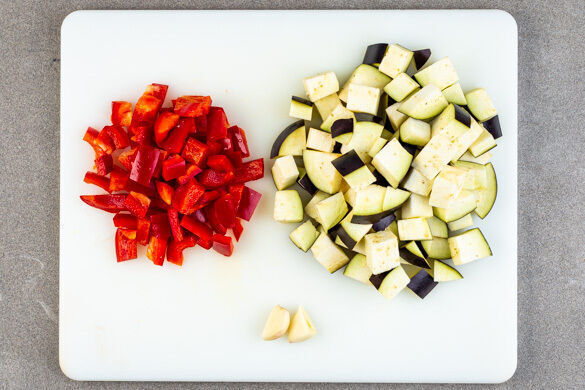 Den Backofen mit Grillfunktion oder Ober-/Unterhitze auf 220°C vorheizen. Die Paprika vierteln, entkernen und in ca. 2cm große Würfel schneiden. Die Auberginen ebenfalls in ca. 2cm große Würfel schneiden. Die Zwiebel schälen und grob würfeln. Zwei Knoblauchzehen schälen und halbieren.