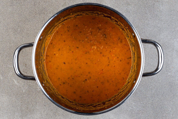 Das Gemüse aus dem Ofen nehmen. Die geröstete Paprika in ein hohes Gefäß geben und mit einem Stabmixer grob pürieren. Den Stabmixer noch nicht abspülen. 2EL Butter in kleine Würfel schneiden, unter die pürierte Paprika mengen und schmelzen lassen.