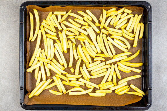Die Pommes aus dem Ofen nehmen und mit dem Käse bestreuen, dann zurück in den Ofen geben und weitere 3–5Min. backen, bis der Käse geschmolzen ist.
