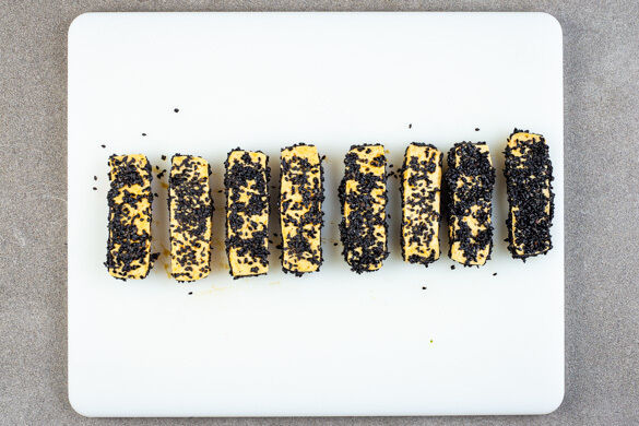 Eine große Pfanne 2–3cm hoch mit Pflanzenöl befüllen und bei mittlerer bis starker Hitze erwärmen. Den Tofu in die Pfanne geben, auf jeder Seite 2–3Min. knusprig braten und auf Küchenkrepp abtropfen lassen. Den Tofu mit der 1/2 der Limettenschale und ggf. übrigem Sesam bestreuen und bis zum Servieren warm halten. Das Öl aus der Pfanne entfernen.