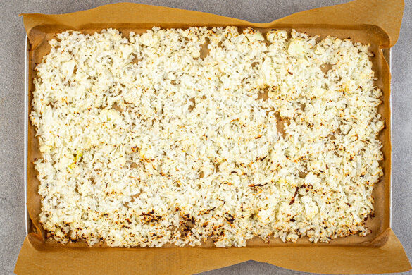 Den Blumenkohlreis auf einem mit Backpapier ausgelegten Backblech mit 2EL Pflanzenöl sowie je 1 kräftigen Prise Salz und Pfeffer vermengen und gleichmäßig verteilen. Im Ofen ca. 10Min. rösten, bis der Blumenkohlreis an den Rändern zu bräunen beginnt.