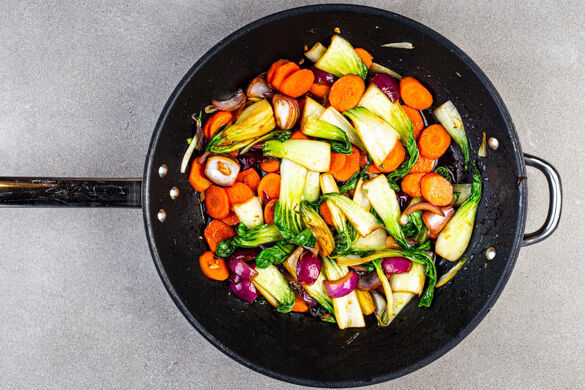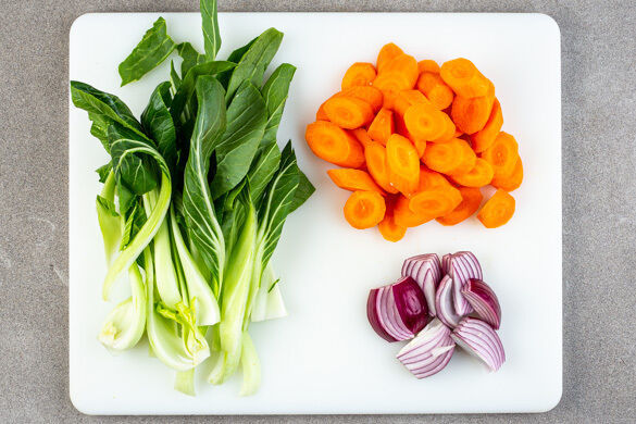 Die Zwiebeln schälen und jeweils in 8 Spalten schneiden. Die Karotten ggf. schälen und schräg in dünne Scheiben schneiden. Den Pak Choi in ca. 1cm breite Streifen schneiden, dabei die harten Strünke entfernen.