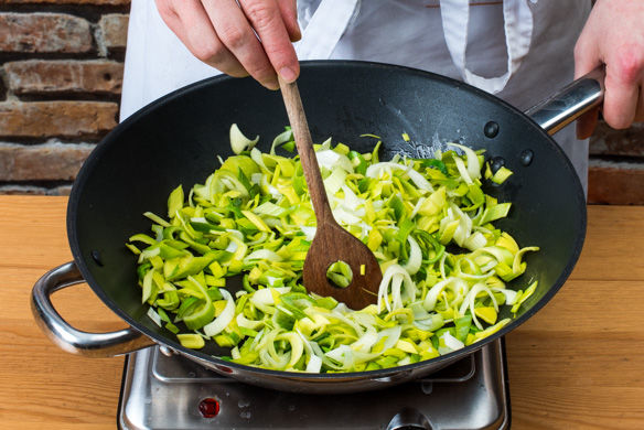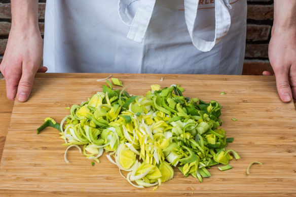 In einem mittelgroßen Topf ausreichend gesalzenes Wasser für die Pasta aufsetzen. Den Lauch der Länge nach halbieren, waschen und in feine Streifen schneiden.